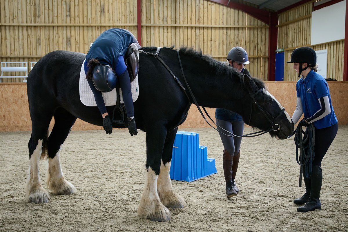 When all is well after leading the horse around, halt is established, and the rider then slowly raises their body so that the horse can start to see a rider above their head. Sometimes this can startle a horse as in the wild a predator above the head is even more of a threat than danger on the ground that a horse feels very confident to flee from. I take time with this phase but rarely find it causes trouble as again polo mints are fed for encouragement and distraction purposes.