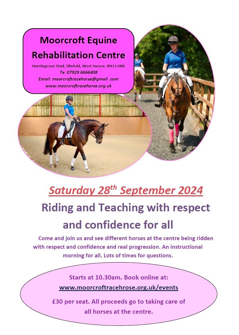 Please join us at Moorcroft Equine Rehabilitation Centre on Saturday 28 September 2024 to see different horses at the Centre being ridden with respect and confidence and real progression.