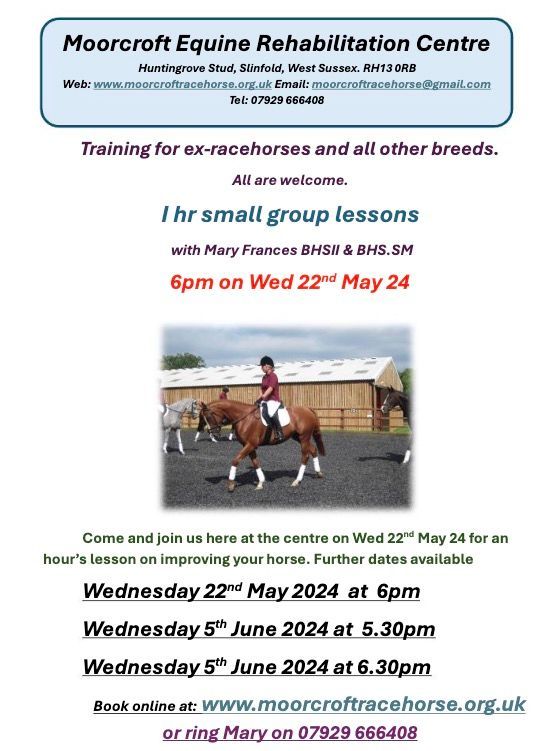 Sessions will be suitable for horses very recently out of training as well as more established partnerships. Mary will be able to adapt to the horses that are present in the sessions.