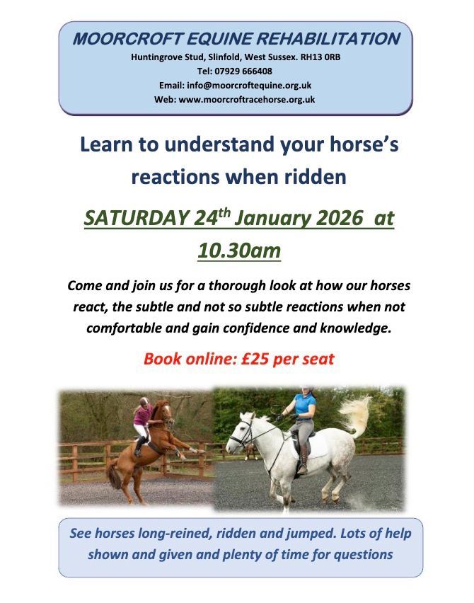 Please join us at Moorcroft Equine Rehabilitation Centre to see a demonstration of the horses being ridden, jumped and long-reined. You will learn to understand your horse's reaction when ridden.