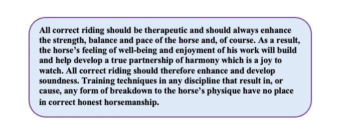 There is one basic essential commitment for Riders and Trainers, and it has the love, respect and welfare of the horse at its heart: