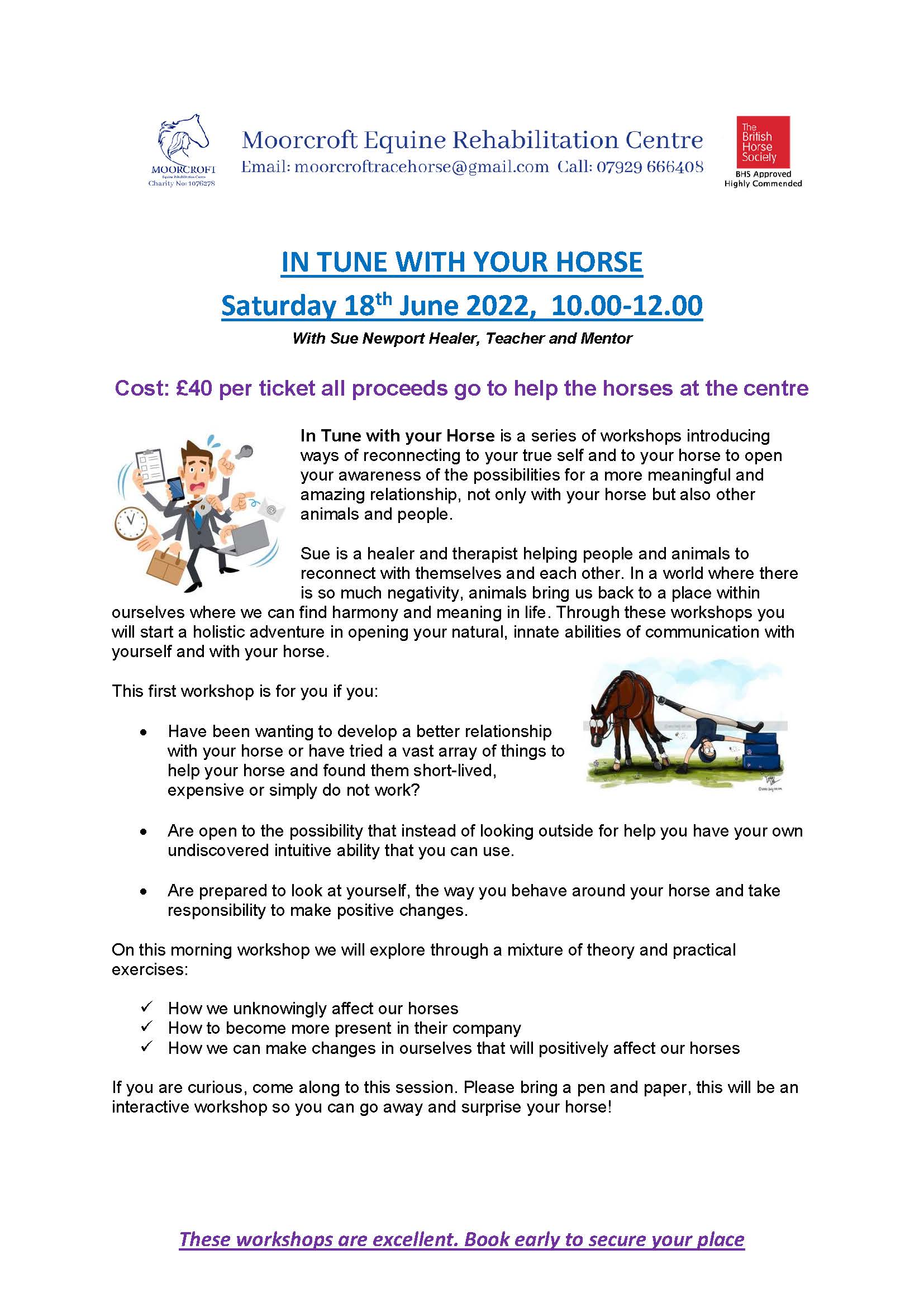 In Tune with your Horse is a series of workshops introducing ways of connecting with yourself and with your horse to awaken your awareness of the possibilities for a more meaningful and amazing relationship, not only with your horse but also other animals and people.