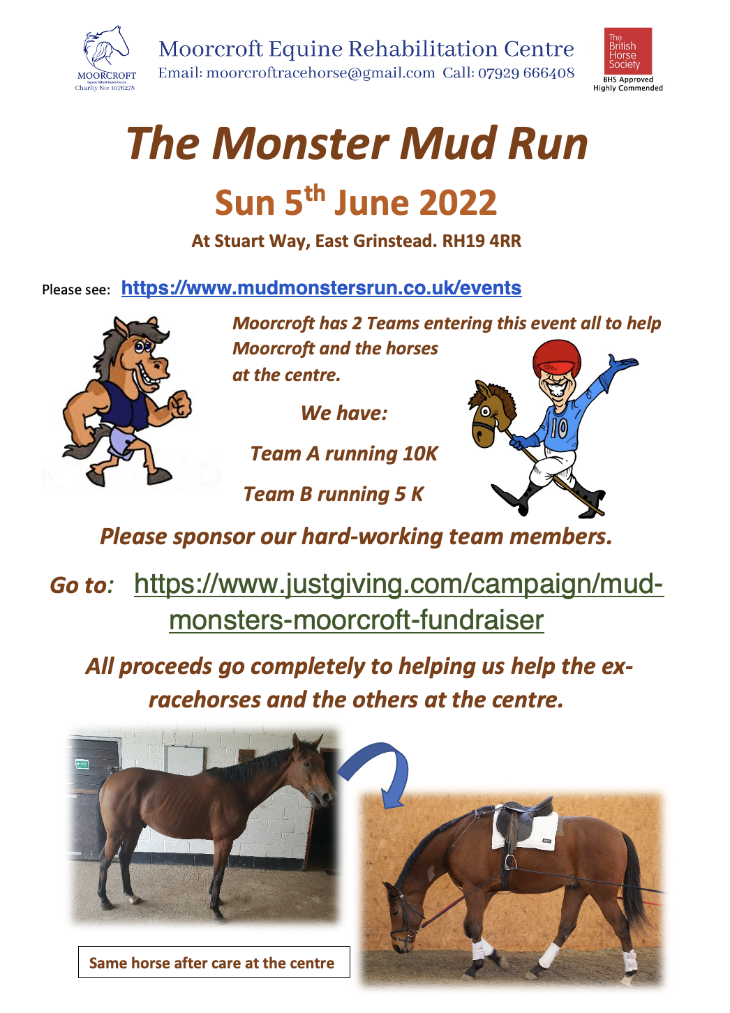 Moorcroft has 2 teams in The Mud Monsters Run raising much needed funds for our charity to support the horses in our care. The event takes place on Sunday 5 June 2022 at the 135 acre site in the beautiful countryside of West Sussex with amazing natural terrain with natural and manmade obstacles.