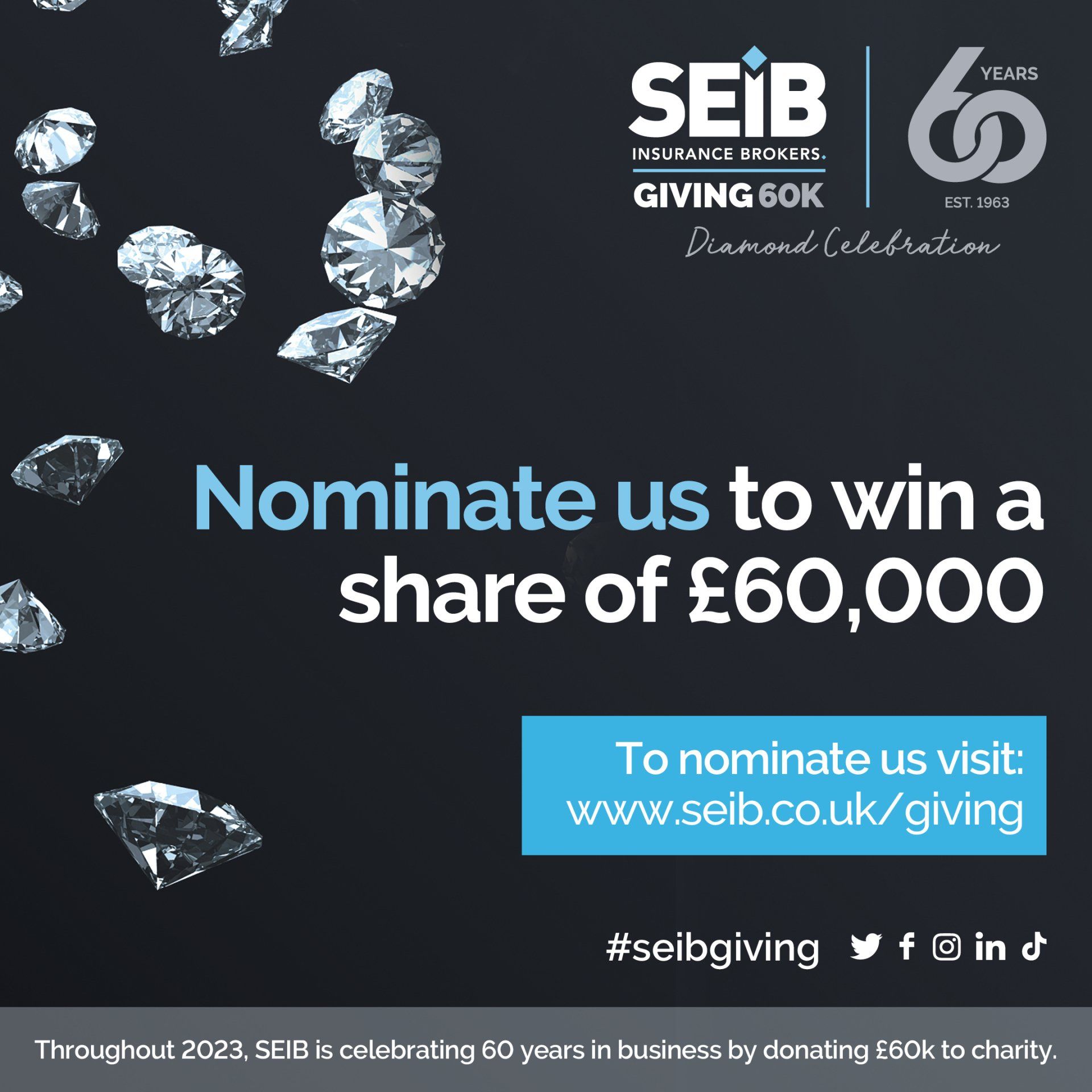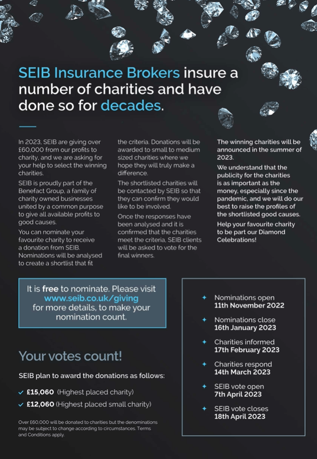 This year, as part of our 60 Year Diamond Celebrations, we’re donating a huge £60,000 to good causes. As with previous years, the campaign has two phases, a public nomination and a final vote exclusively for SEIB clients."